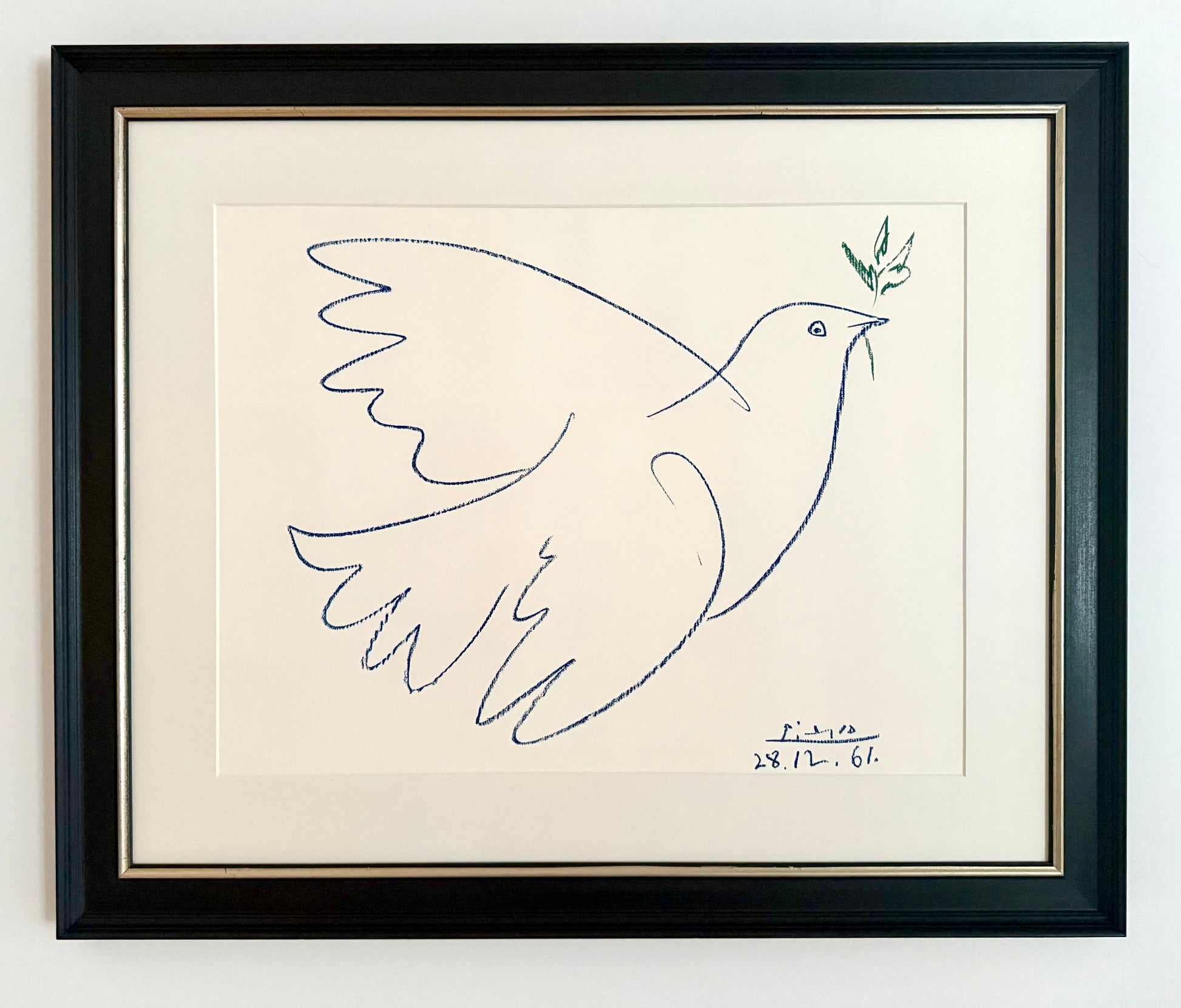 De duif speelt een belangrijke en symbolische rol in het oeuvre van Pablo Picasso, met name als symbool van vrede, vrijheid, en spirituele betekenis. In deze iconische en abstracte schets toont Picasso een eenvoudige maar sierlijke lijntekening van een duif met een olijftak in haar snavel; een universeel symbool van vrede en verzoening.
